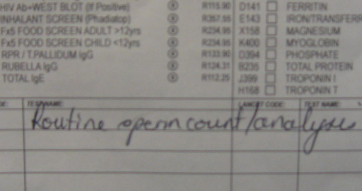 “Right we will do the blood now and then the sperm we will do in the morning.”